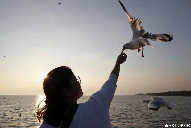 1月2日,游客在泰国曼谷荒废的海滨旅游胜地邦普的海边喂海鸥。新华社发